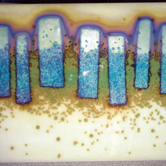 This Kiln Club session will be all about Reaction Potential Samples — a fun, hands-on night of experimenting and learning how different glasses interact when fused together.. Many colors of glass will react to each other based on their chemical make up. The result is a new color where the two glass colors touch. The amount of the reactive chemical in the glass recipe, the fusing temperature, and the number of times the glass is heated can all make a difference in the final effect.